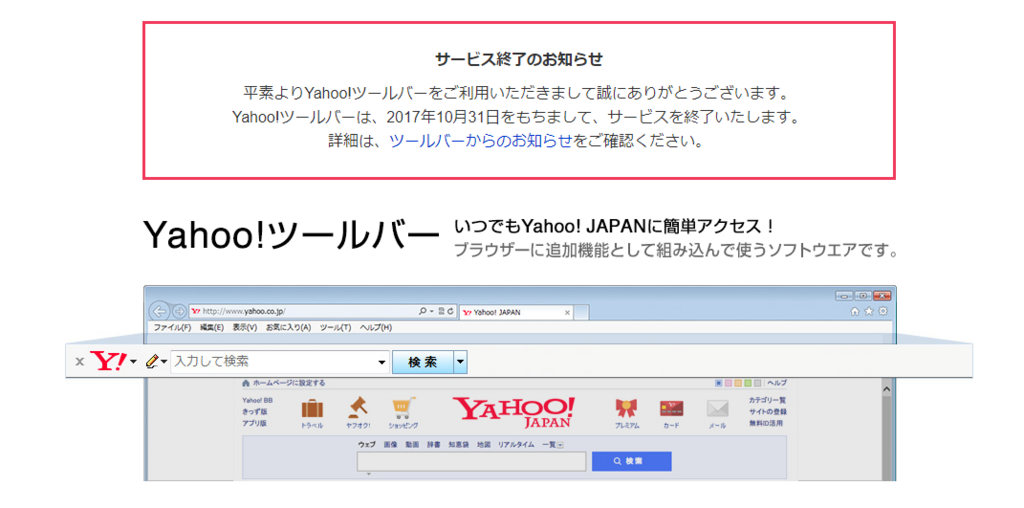 2017年10月31日、Yahoo! JapanのInternet Explorer(以下IE)向けサービスである、「Yahoo! ツールバー」がサービスを終了(DL自体はすでに8月で終了している)。